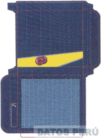 El diseño de una caja-empaque rectangular de color azul con fondo cuadriculado, que presenta el diseño de dos grageas, sobre una banda de color amarillo, todo en los colores azul, amarillo, azul acero, rojo, anaranjado y blanco; conforme al modelo adjunto