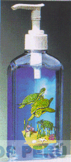 EL DISEÑO QUE PRESENTA FIGURAS DE TORTUGAS MARINAS Y ALGAS MARINAS QUE EVOCAN MOVIMIENTO DE FLOTACION EN LIQUIDO, TODO EN LOS COLORES AZUL, CELESTE, BLANCO, AMARILLO, VERDE, MORADO, ANARANJADO, CONFORME AL FACSIMIL ADJUNTO SIN REIVINDICAR LA FORMA DEL ENVASE,