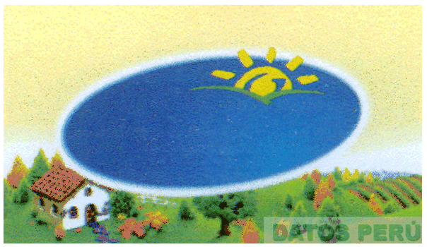 LA ETIQUETA RECTANGULAR QUE CONTIENE EL DISEÑO DE UN PAISAJE RURAL QUE PRESENTA UNA CASA PEQUEÑA, ARBOLES, FLORES Y SEMBRIOS, Y UNA FIGURA ELIPTICA QUE INCLUYE EL DISEÑO ESTILIZADO DE UN SOL, TODO EN LOS COLORES AMARILLO, AZUL, VERDE, ROJO, BLANCO, MARRON Y VIOLETA, CONFORME AL FACSIMIL ADJUNTO