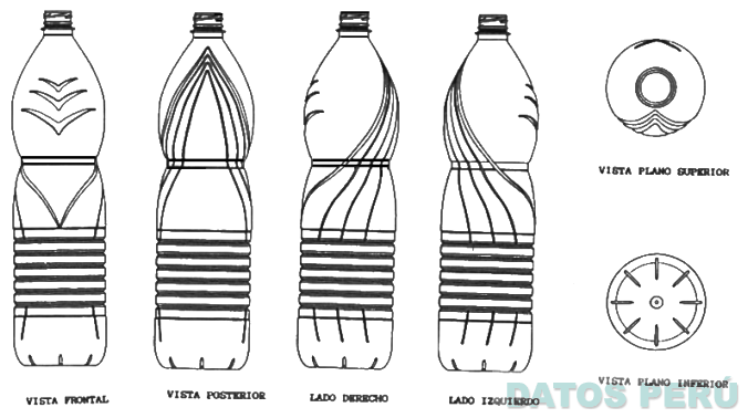 EL ENVASE DE FORMA SUSTANCIALMENTE CILINDRICA CON UNA BASE DE LIGERO MENOR DIAMETRO EN LA PARTE BAJA SE OBSERVAN UNA SUCESION DE REBAJES HORIZONTALES, EN LA PARTE MEDIA SUPERIOR SE OBSERVA UNA LINEA HORIZONTAL, LA CUAL FORMA UNA CINTURA EN EL ENVASE, DESDE LA CUAL SE MUESTRA UNA FORMA ANGULAR HACIA ABAJO, EN LA PARTE SUPERIOR SE MUESTRAN TRES FIGURAS ANGULARES SOBRE LA PARTE CONICA, LA CUAL REMATA EN UN PICO ROSCADO, CONFORME AL MODELO ADJUNTO