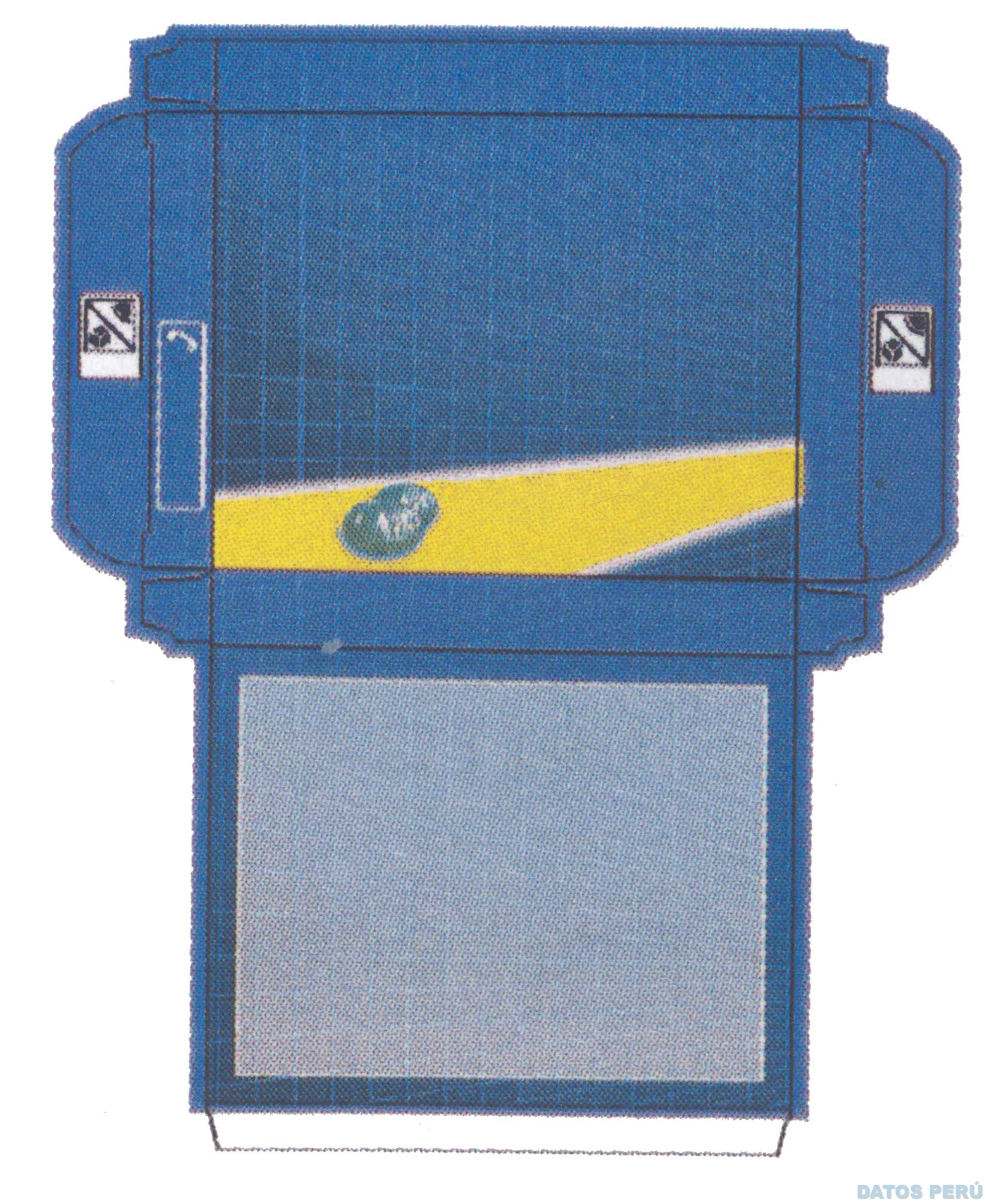 El diseño de una caja-empaque rectangular con fondo cuadriculado y que presenta el diseño de dos cápsulas sobre una banda de color amarillo, todo en los colores azul, celeste, amarillo, gris, blanco y negro; conforme al modelo adjunto