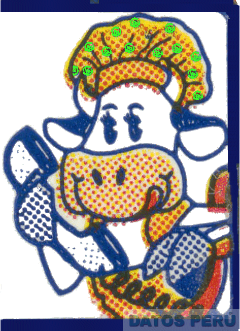 La figura caricaturizada de una vaca con gorro, la misma que se aprecia sosteniendo el auricular de un teléfono, todo en los colores verde, amarillo, azul, rojo, blanco y melón; conforme al modelo adjunto