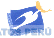 La figura estilizada de un ave sosteniendo con el pico un pescado dentro de una figura ondulante con sombreado, todo en los colores blanco, amarillo, azul oscuro y azul claro; conforme al modelo adjunto