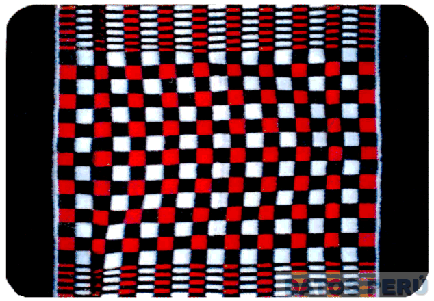 La figura rectangular conteniendo una sucesión de franjas horizontales y verticales que al cruzarse entre sí forman una especie de damero sobre su parte central, a los costados en forma opuesta se advierten una sucesión de estrías formadas por rectángulos pequeños, todo en los colores negro, rojo y blanco; conforme al modelo adjunto