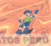 El logotipo conformado por la figura de un niño con los brazos extendidos, el cual tiene un pañuelo en la cabeza, muñequeras, guantes, coderas, rodilleras y zapatillas y se encuentra subido en una patineta, todo sobre un fondo que asemeja una superficie líquida en movimiento, en los colores beige, azul, marrón, rojo, amarillo, verde, negro, rosado y anaranjado en distintas tonalidades; conforme al modelo adjunto
