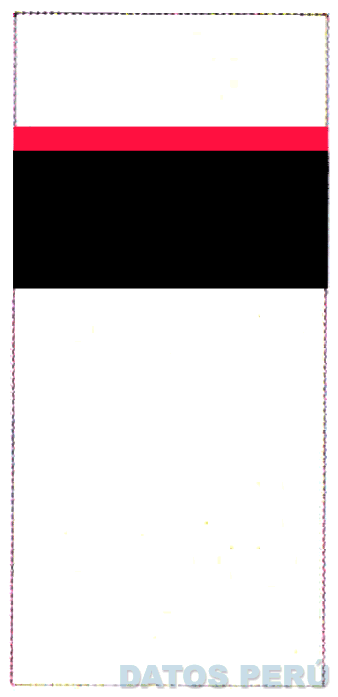 El logotipo conformado por el diseño de una etiqueta rectangular en posición vertical, que presenta dos franjas horizontales de distinta dimensión en su parte superior; todo en los colores rojo, negro y blanco; conforme al modelo adjunto
