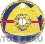 El logotipo conformado por una figura circular de doble borde conteniendo una figura triangular con lados curvos, dentro de ello una figura circular y líneas, todo en los colores negro, gris, blanco, rojo y amarillo; conforme al modelo adjunto
