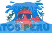 La figura característica de una fresa surfeando y con lentes; asimismo se aprecian tres palmeras y una ola de mar; en los colores rojo, verde, azul, blanco, celeste, amarillo y negro; conforme al modelo adjunto