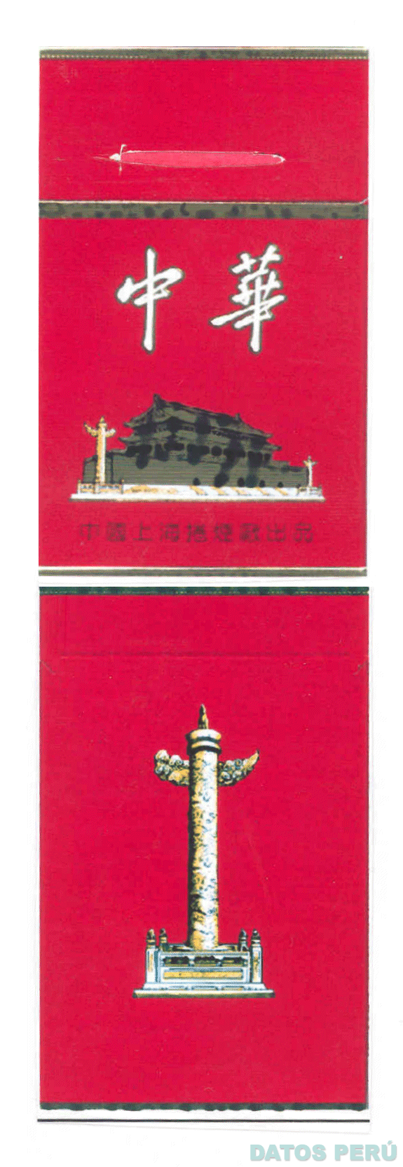 La etiqueta rectangular de color rojo y dorado, donde se verifica caracteres chinos en color blanco y las figuras de un edificio chino de color dorado y la figura de una columna; conforme al modelo adjunto