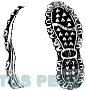 El logotipo conformado por la figura bidimensional de una planta de calzado, en cuya suela se aprecian figuras irregulares alrededor; asimismo, se observan tres figuras ovaladas, donde la primera presenta triángulos y una línea irregular, la segunda líneas paralelas y la tercera contiene triángulos; conforme al modelo adjunto