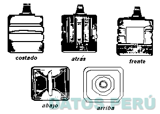 UN ENVASE DE BASE CUADRADA, EL CUERPO ES DE FORMA CUADRADA, CON RANURAS EN BAJO RELIEVE, 4 EN FORMA VERTICAL EN LA PARTE POSTERIOR DEL BIDON Y 3 EN FORMA HORIZONTAL EN LOS FLANCOS EN LA PARTE CENTRAL, LA PARTE DEL CUELLO COMIENZA CON UNA FORMA ENSANCHADA Y TERMINA EN UNA BOCA CIRCULAR, EL FRENTE DE LA BOTELLA FORMA UN CUADRADO