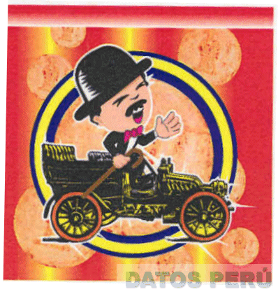 El logotipo conformado por el diseño caricaturizado de un hombre con bigotes, sentado en un coche de color negro, anaranjado, blanco y amarillo, vistiendo un frack y sombrero negro, camisa blanca y una corbata michi color fucsia sosteniendo además un bastón color marrón en la mano derecha, todo sobre una circunferencia de color amarillo y bordes azules, con fondo color naranja donde se aprecian diseños estilizados de galletas; conforme al modelo adjunto