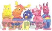 La figura caricaturizada de diversos personajes tales como un hipopótamo, un alce, un pingüino, una hormiga y un perro, todo en los colores verde, anaranjado, azul, rosado, celeste, morado, rojo, amarillo, blanco y negro; conforme al modelo adjunto