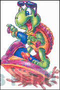 La figura estilizada de una tortuga sobre una moto acuática, en la combinación de colores verde, rojo, morado, fucsia, azul y anaranjado; conforme al modelo adjunto