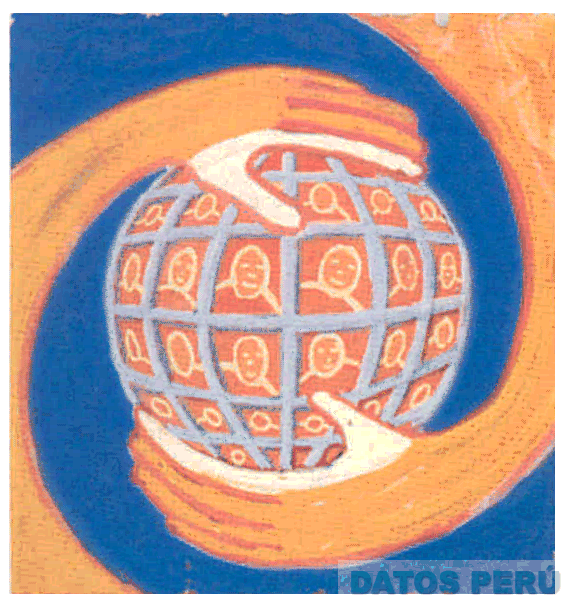 La etiqueta rectangular de fondo azul con la representación estilizada de dos manos en color anaranjado y blanco envolviendo una esfera cuadriculada en colores celeste y anaranjado conteniendo en cada cuadrícula la representación de rostros de personas en color crema; conforme al modelo adjunto
