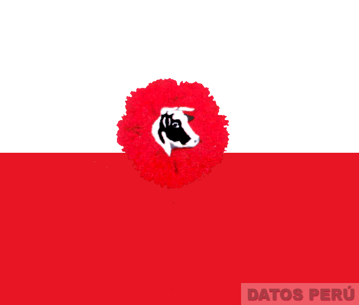 La etiqueta conformada por la figura de un clavel de color rojo, en cuyo interior aparece la figura de la cabeza de una vaca, en colores blanco y negro; todo sobre un fondo de dos campos horizontales de colores blanco y rojo; conforme al modelo adjunto
