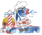 El logotipo conformado por la figura estilizada de un pescado con gorro de cheff y babero; sosteniendo un plato con langosta, sobre el mar y al lado de un faro y como fondo se aprecia la puesta del sol, con dos nubes y aves volando; todo en los colores blanco, negro, azul, celeste, marrón, rojo y amarillo; conforme al modelo adjunto