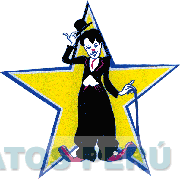El logotipo conformado por el diseño de un payaso con prendas de vestir color azul marino, camisa blanca y corbata roja, chaqueta con filos de color rojo en la solapa, con cinturón rojo, sombrero color azul marino en la mano derecha y un bastón a la mano izquierda, zapatos grandes de color rojo, al centro de una estrella de cinco puntas de color amarillo con bordes de color azul; conforme al modelo adjunto