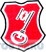 La representación estilizada de una llave en colores blanco y negro sobre una figura irregular a manera de escudo de fondo color rojo con borde blanco y negro; conforme al modelo adjunto