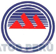 La representación estilizada de dos figuras triangulares cortadas de color rojo, encerradas en dos círculos de color azul con rayas de fondo, que cubren hasta la mitad superior del círculo; conforme al modelo adjunto