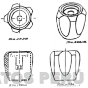 LA REPRESENTACION DE LA FIGURA DE UNA PERILLA DE FORMA GEOMETRICA IRREGULAR CON HENDIDURAS EN LA PARTE LATERAL EN FORMA OVALADA VISTA EN SUS CUATRO POSICIONES (ARRIBA, ABAJO, DE COSTADO Y FRONTAL), CONFORME AL MODELO ADJUNTO,