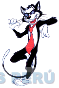 La figura estilizada de un gato sonriente vestido con corbata y gafas oscuras, todo en la combinación de colores blanco, rojo y negro; conforme al modelo adjunto