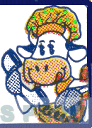 La figura caricaturizada de una vaca con gorro, la misma que se aprecia sosteniendo el auricular de un teléfono, todo en los colores verde, amarillo, azul, rojo, blanco y melón; conforme al modelo adjunto