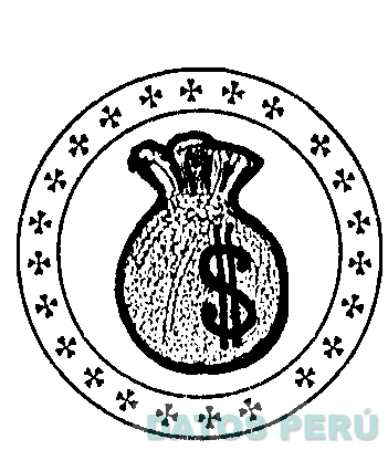 La figura de una bolsa de monedas con el signo de dólares con dos círculos y figuras de trebol de 4 hojas en el contorno conforme al modelo