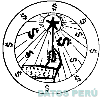 Una mano sosteniendo una barita mágica, rodeado de símbolos del dolar con dos círculos y fígura del signo de dólares en todo el contorno conforme al modelo adjunto