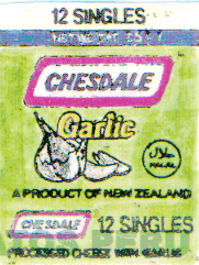 LA ETIQUETA ENVOLTURA DE FONDO VERDE LIMON QUE CONTIENE DE MODO DESTACADO EL LOGOTIPO CHESDALE EN LETRAS AZULES, ESCRITAS EN UN RECTANGULO DE FONDO BLANCO, ENMARCADO CON BORDES ROJOS, EN LA PARTE SUPERIOR LA PALABRA 12 SINGLES (COMO INDICATIVO DE LAS PORCIONES INDIVIDUALES DE QUESO QUE CONTIENE). EN LA PARTE CENTRAL LA FIGURA DE AJOS Y EL VOCABLO GARLIC Y LA FIGURA DEL LOGOTIPO HALAL DENTRO DE UN CIRCULO, EN LOS COLORES AMARILLO Y BEIGE