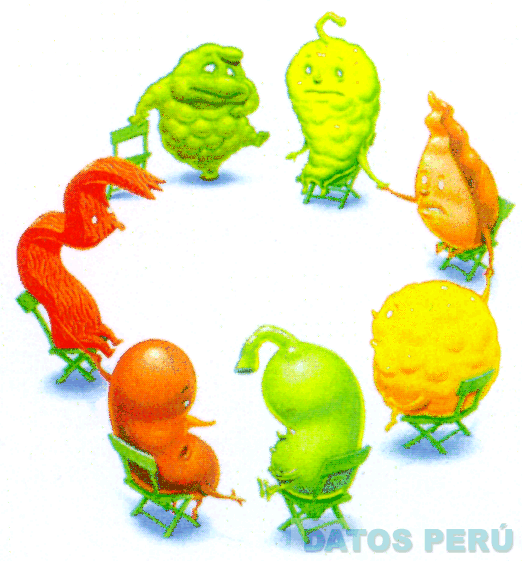 LA REPRESENTACION CARICATURESCA DE UN CONJUNTO DE 7 TUBERCULOS Y LEGUMBRES EN COLORES VERDE, MARRON, AMARILLO Y ANARANJADO, FORMANDO UN CIRCULO SENTADOS SOBRE SILLAS COLOR VERDE, CONFORME AL MODELO ADJUNTO,