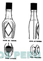 UN ENVASE (FRASCO) DE CUELLO ALARGADO, CON UN PAR DE ANILLOS, TAPA ROSCANTE, CUERPO OVOIDAL EN EL QUE SE APRECIA UN ROMBO DENTRO DE UN ARCO EL QUE CUBRE TODO EL CUERPO, DESCANSA EN UNA BASE OVAL CON LAS INICIALES GRABADAS