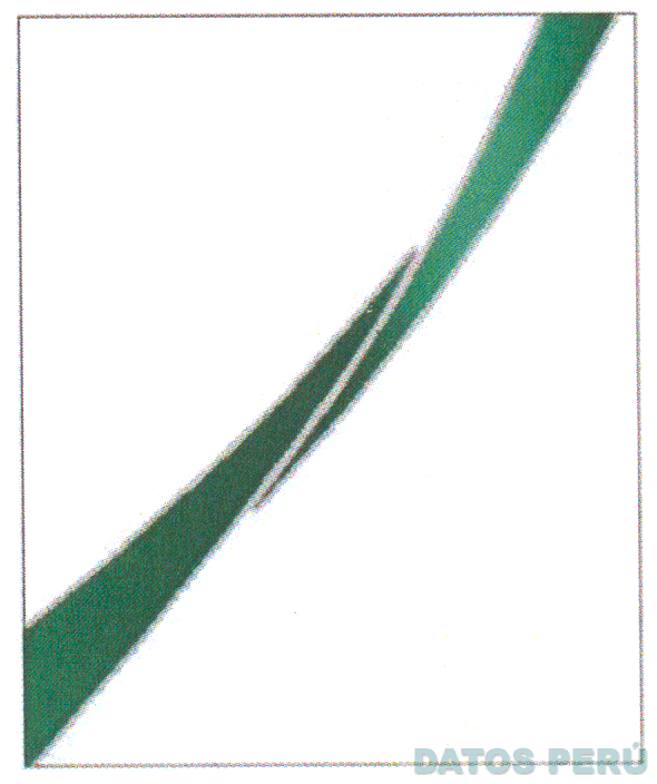 Una etiqueta rectangular de fondo de color blanco, en cuya parte central aparece una figura de forma irregular de color verde en distintas tonalidades con bordes de color plateado; conforme al modelo adjunto