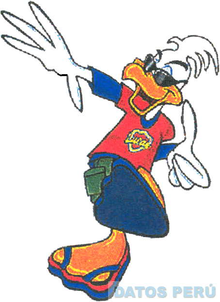 El diseño caricaturizado de un pato luciendo lentes de sol y evocando movimiento, todo en los colores rojo, anaranjado, azul, verde, amarillo, celeste, blanco y negro; conforme al modelo adjunto