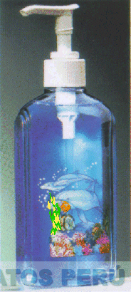 EL DISEÑO QUE PRESENTA FIGURAS DE DELFINES Y ALGAS MARINAS QUE EVOCAN MOVIMIENTO DE FLOTACION EN LIQUIDO, TODO EN LOS COLORES AZUL, CELESTE, BLANCO, AMARILLO, VERDE, ROSADO, ANARANJADO, ROJO Y NEGRO, CONFORME AL FACSIMIL ADJUNTO SIN REIVINDICAR LA FORMA DEL ENVASE,