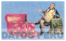 LA FIGURA DE UN HOMBRE SENTADO, QUE VISTE UN SACO AZUL, CAMISA AMARILLA, PANTALON MARRON, CON EL BRAZO DERECHO APOYADO EN UNA MESA CON MATEL LARGO VERDE; A SUS PIES SE PUEDE APRECIAR UN COFRE ABIERTO LLENO DE JOYAS, PREDOMINAN LOS COLORES CELESTE, ROJO, AMARILLO Y DEMAS, CONFORME AL MODELO ADJUNTO,