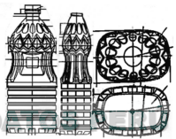 EL ENVASE EN FORMA ALARGADA Y ENCURVADA EN LA PARTE CENTRAL, CUYO CUELLO TIENE FORMA CILINDRICA CON DOS ANILLOS EN ALTO RELIEVE, EL ANILLO INFERIOR DECORATIVO Y EL SUPERIOR FUNCIONAL EN LA FIJACION DE LA TAPA, EN LA PARTE SUPERIOR SE APRECIAN FIGURAS PEQUEÑAS OVALADAS Y EL DISEÑO DE FIGURAS TRIANGULARES DECORATIVAS EN ALTO RELIEVE EN TODA LA CIRCUNFERENCIA, EN LA PARTE CENTRAL LA FIGURA DE UN CUADRILATERO INCRUSTADO EN OTRO, EN LA PARTE INFERIOR SE APRECIA DOBLES LINEAS HORIZONTALES QUE RODEAN TODO EL ENVASE, EN LA BASE TIENE COCADAS EN FORMA TRIANGULAR, CONFORME AL MODELO