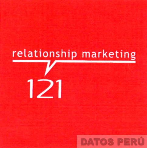 El logotipo conformado por un recuadro en cuyo interior se aprecia la denominación RELATIONSHIP MARKETING subrayado por una línea irregular y debajo los números 121; en los colores rojo y blanco; conforme al modelo adjunto