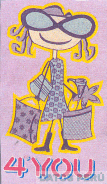 EL LOGOTIPO CONFORMADO POR LA CARICATURA DE UNA MUJER, CON GAFAS, VESTIDO CON FIGURITAS Y BOTAS, ADEMAS LLEVA UN BOLSO COLGADO AL HOMBRO Y EN SUS MANOS SOSTENIENDO UN BOLSO DE COMPRAS EN CADA UNA, TODO EN LOS COLORES LILA, AMARILLO Y CELESTE Y EN LA PARTE INFERIOR LA DENOMINACION 4 YOU, EN COLOR ROJO; CONFORME AL MODELO ADJUNTO