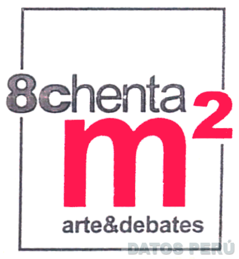 El logotipo conformado por la denominación 8CHENTA M2 ARTE&DEBATES escrita en letras características, sobrepuesta a una figura rectangular; todo en los colores rojo y plomo; conforme al modelo adjunto
