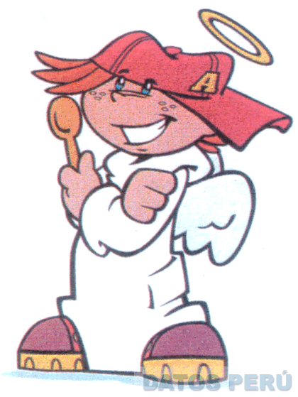 LA FIGURA CARICATURESCA DE UN NIÑO SONRIENTE CON PELO COLOR MARRON Y OJOS AZULES, REPRESENTANDO A UN ANGEL CON ALAS BLANCAS Y AUREOLA AMARILLA, EL NIÑO ESTA VESTIDO CON UN TRAJE BLANCO, GORRA ROJA CON LA LETRA A AMARILLA, ZAPATILLAS ROJAS, MARRONES Y AMARILLAS, Y SE ENCUENTRA SOSTENIENDO UNA CUCHARA AMBAR; CONFORME AL MODELO ADJUNTO