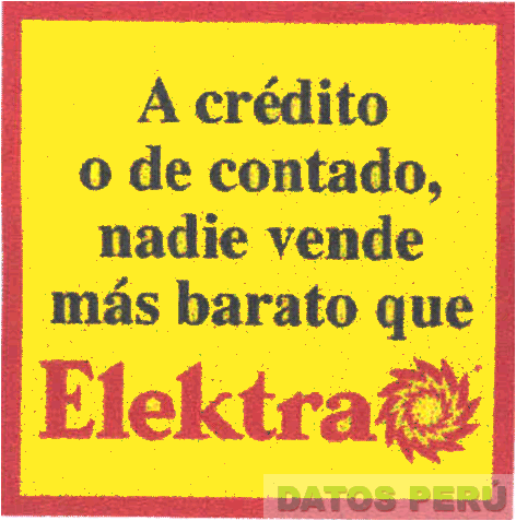 EL LOGOTIPO CONFORMADO POR LA FIGURA CUADRANGULAR QUE EN SU INTERIOR LLEVA LA DENOMINACION A CREDITO O DE CONTADO, NADIE VENDE MAS BARATO (SIN REIVINDICAR) QUE ELEKTRA ESCRITA EN LETRAS CARACTERISTICAS, Y LA FIGURA ESTILIZADA DE UN SOL EN LOS COLORES AMARILLO, ROJO Y NEGRO; CONFORME AL MODELO ADJUNTO