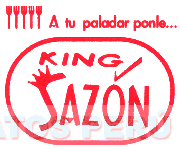El logotipo conformado por la denominación KING SAZON escrita en letras característica y apareciendo una corona y un check sobre las letras S y O respectivamente; todo dentro de una figura ovalada; asimismo, en la parte superior se aprecia la frase A TU PALADAR PONLE... antecedida por la figura estilizada de cinco tenedores; todo en color rojo; conforme al modelo adjunto.