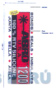 La etiqueta rectangular dividida en dos franjas, en cuya parte superior externa se aprecian los términos BONDS, SEALS e INSULATES, separados por asteriscos, y en la parte inferior externa se aprecian los términos JUNTA, SELLA y AISLA, separados por asteriscos; en la franja superior se aprecia la figura de un asterisco que se extiende hacia la letra A de la denominación ABRO escrita en letras características, y el número 1200, sin reivindicar el término U.S.A. y el símbolo ®; y en la franja inferior se aprecian los términos 100%, RTV SILICONE, sin reivindicar la figura irregular de color amarillo; todo en los colores rojo, negro y blanco; conforme al modelo adjunto