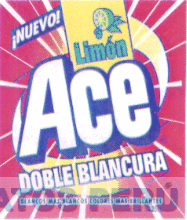 LA ETIQUETA CONTENIENDO LA DENOMINACION ACE ESCRITA EN FORMA CARACTERISTICA, EL DISEÑO DE LA MITAD DE UN LIMON, LAS LEYENDAS DOBLE BLANCURA Y BLANCOS MAS BLANCOS COLORES MAS BRILLANTES Y LA COMBINACION DE COLORES AMARILLO, VERDE, ROJO, AZUL Y BLANCO EN LA ETIQUETA SE OBSERVA LA FIGURA DE UN REMOLINO Y LINEAS