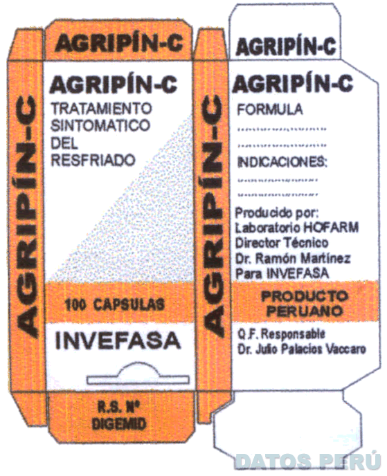 LA CAJA EMPAQUE CONTENIENDO LA DENOMINACION AGRIPIN-C ESCRITA EN LETRAS CARACTERISTICAS EN COLOR NEGRO EN UNO DE LOS LADOS SE APRECIA LA FIGURA DE UN TRIANGULO RECTANGULO CUYA BASE ES COLOR ANARANJADO Y EL CUERPO ES COLOR GRIS-PLATA, ASIMISMO SE APRECIA LA DENOMINACION INVEFASA, LA LINEA DE LA BASE SE PROLONGA HASTA LA PARTE POSTERIOR DE LA CAJA, LOS LADOS LATERALES DE LA CAJA SON DE COLOR ANARANJADO Y EN ELLOS SE APRECIA LA DENOMINACION AGRIPIN-C; CONFORME AL MODELO ADJUNTO