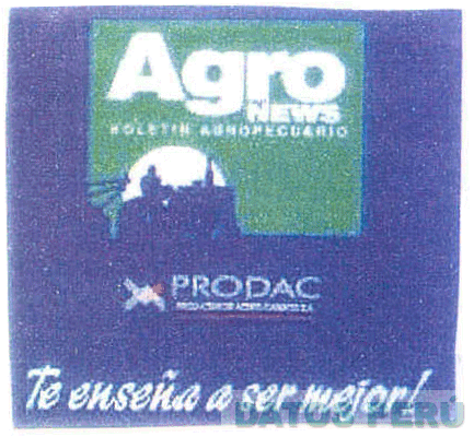 EL LOGOTIPO CUADRANGULAR CONFORMADO POR LA DENOMINACIÓN AGRO NEWS ESCRITA EN LETRAS CARACTERÍSTICAS, Y LA FRASE BOLETÍN AGROPECUARIO ESCRITA EN LETRAS CARACTERÍSTICAS, CON EL DISEÑO ESTILIZADO DE UN TRACTOR Y UN HOMBRE DENTRO DE UNA FIGURA CUADRANGULAR; EN LA PARTE INFERIOR LA FRASE TE ENSEÑA A SER MEJOR! ESCRITA EN LETRAS CARACTERÍSTICAS Y EL LOGOTIPO DE PRODAC, EN LOS COLORES VERDE, AZUL, ROJO Y BLANCO; CONFORME AL MODELO ADJUNTO
