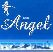 El logotipo conformado por la denominación AGUA ANGEL escrita en letras características, en la parte superior se aprecia el diseño de un ángel y en la parte inferior el diseño de tres cerros y tres líneas horizontales, todo en la combinación de colores blanco, azul claro, azul oscuro y celeste; conforme al modelo adjunto