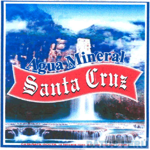 El logotipo conformado por la denominación AGUA MINERAL SANTA CRUZ escrita en letras características donde SANTA CRUZ se encuentra dentro de una franja, asimismo, como fondo se aprecia las figuras de una catarata y nubes en la parte superior, y en la parte inferior arbustos, una laguna, piedras y pequeñas caídas de agua, todo en los colores rojo, blanco, azul, marrón, celeste; conforme al modelo adjunto