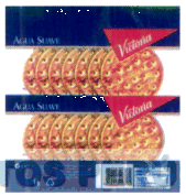 LA DENOMINACION AGUA SUAVE - VICTORIA FIGURA DE GALLETAS APILADAS Y FRANJAS AZULES CON LA PALABRA AGUA SUAVE Y UN TRIANGULO ROJO CON LA EXPRESION VICTORIA EN COLOR BLANCO, EN LOS COLORES AZUL, ROJO, BLANCO Y AMARILLO, SEGUN MODELO ADJUNTO,